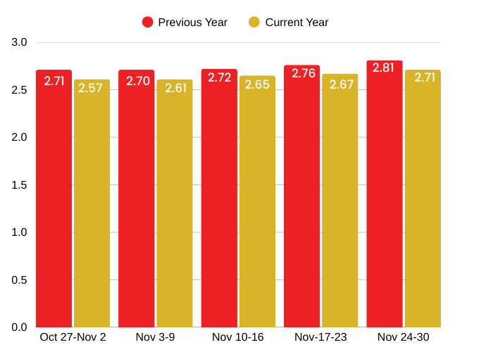 Month-on-month comparisons also showed positive movement, with average weekly volumes in November rising 3% compared to October. Asia Pacific (+5%) and CSA (+6%) led this increase, while Africa and MESA also recorded modest gains. Slight declines were observed from North America and Europe, reflecting normal market fluctuations.