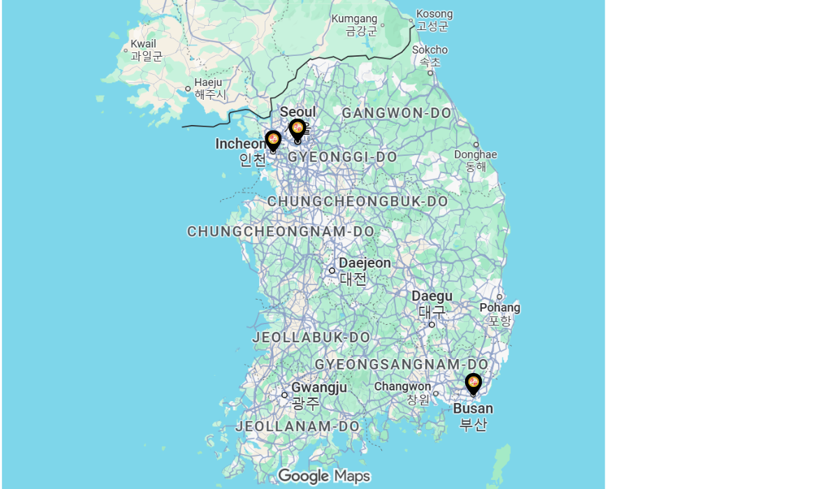 With offices strategically located near the major industrial hubs and ports namely in Ulsan (automobiles, shipbuilding, petrochemicals), Pohang (steel manufacturing, battery materials), Gumi (electronics, particularly mobile phones and LCDs), and the Banwol-Siwha industrial complex in Ansan (semiconductors, machinery, electronics) we deliver the personalized service across all the major international airports (including Incheon International Airport (ICN), Gimpo International Airport and Gimhae International Airport) major seaports (including Busan, Incheon, Gwangyang, Ulsan, and Pohang.) to more than 160 countries.