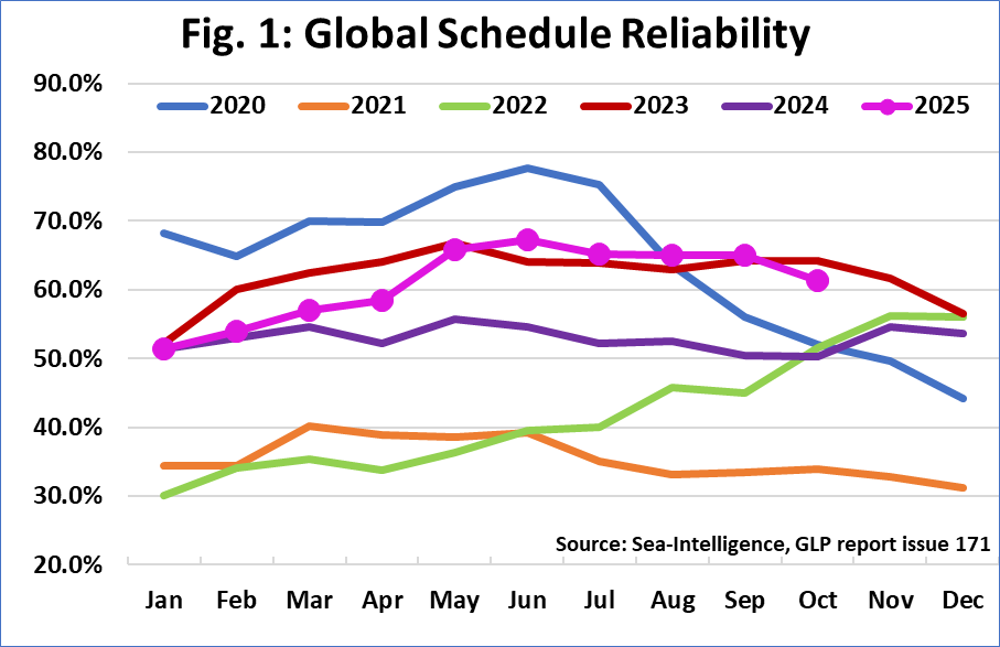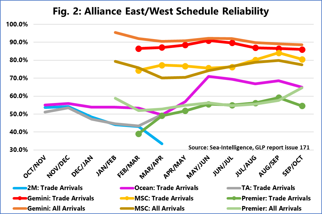 In September/October 2025, Gemini Cooperation recorded 88.6% schedule reliability across ALL arrivals, and 86.0% across TRADE arrivals, followed by MSC at 77.5% for ALL arrivals and 80.5% for TRADE arrivals, while Premier Alliance recorded 64.6% for ALL arrivals and 54.6% across TRADE Arrivals. For the “old” alliances, “ALL arrivals” are equal to “TRADE arrivals”, and Ocean Alliance scored 65.0%.